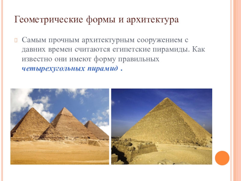египетские пирамиды. Как известно они имеют форму правильных четырехугольных пирамид .
