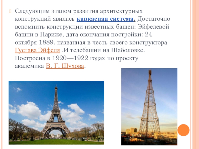 известных башен: Эйфелевой башни в Париже, дата окончания постройки: 24 октября 1889. названная в честь своего конструктора Густава Эйфеля .И телебашни на Шаболовке.Построена в 1920—1922 годах по проекту академика В. Г. Шухова.