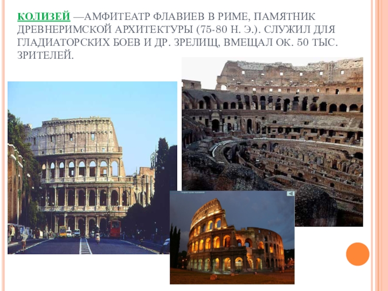 Слайд 18КОЛИЗЕЙ —АМФИТЕАТР ФЛАВИЕВ В РИМЕ, ПАМЯТНИК ДРЕВНЕРИМСКОЙ АРХИТЕКТУРЫ (75-80 Н. Э.).