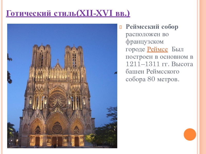 основном в 1211–1311 гг. Высота башен Реймсского собора 80 метров.
