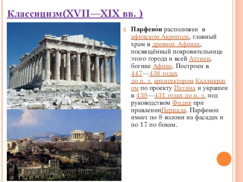 покровительнице этого города и всей Аттики, богине Афине. Построен в 447—438 годах до н. э. архитектором Калликратом по проекту Иктина и украшен в 438—431 годах до н. э. под руководством Фидия при правленииПерикла. Парфенон имеет по 8 колонн на фасадах и по 17 по бокам.