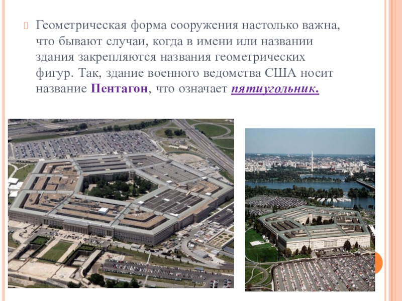 или названии здания закрепляются названия геометрических фигур. Так, здание военного ведомства США носит название Пентагон, что означает пятиугольник.