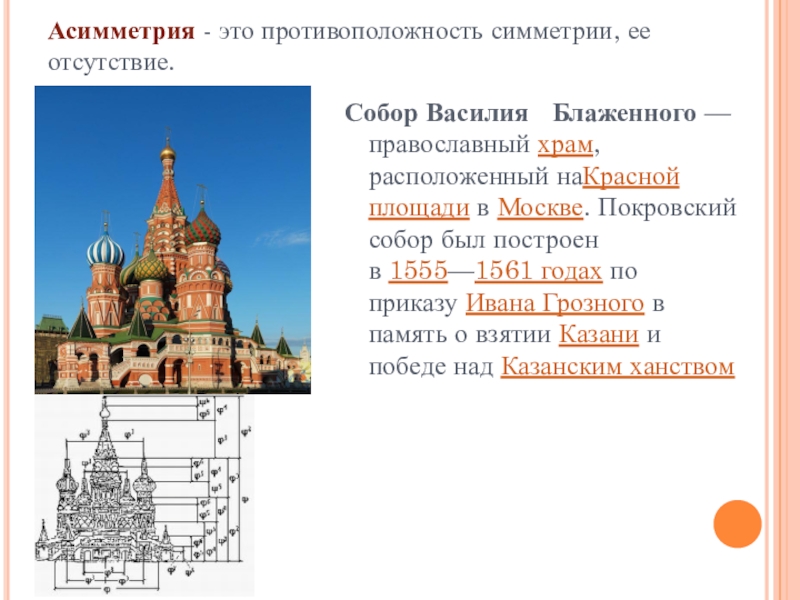 православный храм, расположенный наКрасной площади в Москве. Покровский собор был построен в 1555—1561 годах по приказу Ивана Грозного в память о взятии Казани и победе над Казанским ханством