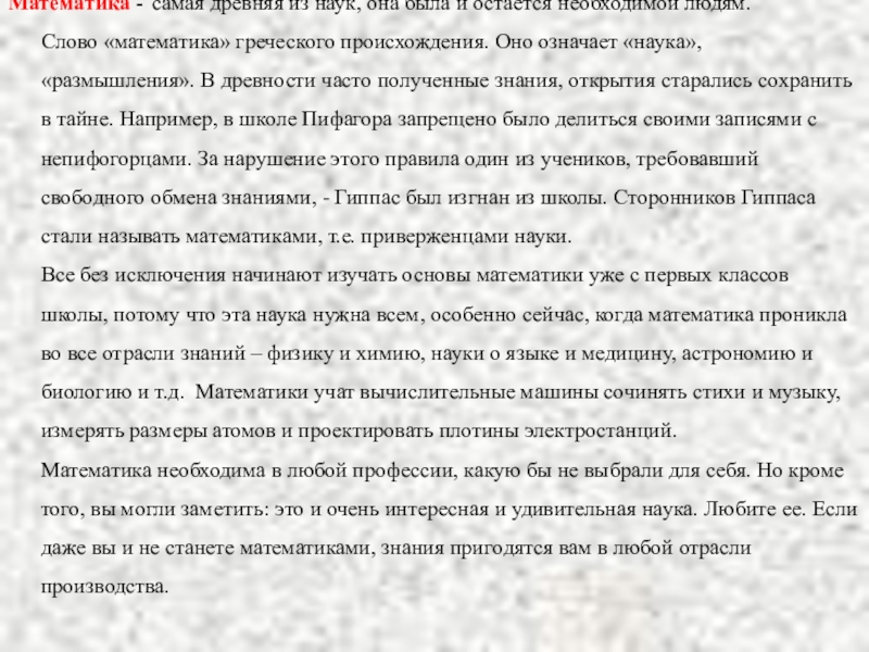 Слово «математика» греческого происхождения. Оно означает «наука», «размышления». В древности часто полученные знания, открытия старались сохранить в тайне. Например, в школе Пифагора запрещено было делиться своими записями с непифогорцами. За нарушение этого правила один из учеников, требовавший свободного обмена знаниями, - Гиппас был изгнан из школы. Сторонников Гиппаса стали называть математиками, т.е. приверженцами науки.