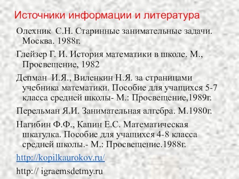 Нагибин Ф.Ф., Капин Е.С. Математическая шкатулка. Пособие для учащихся 4-8 класса средней школы.- М.: Просвещение.1988г.