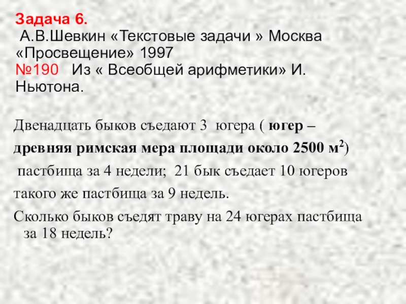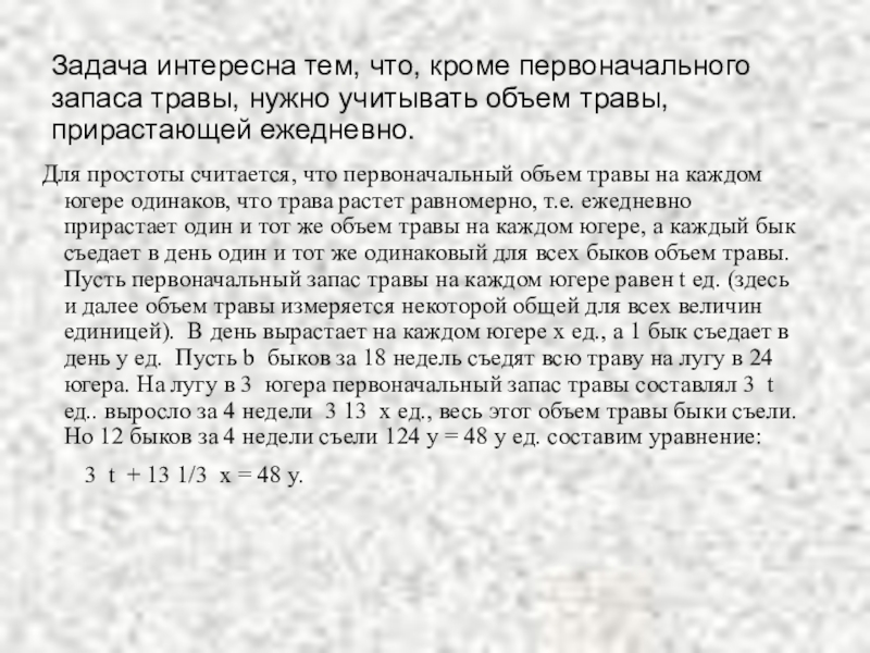 Для простоты считается, что первоначальный объем травы на каждом югере одинаков, что трава растет равномерно, т.е. ежедневно прирастает один и тот же объем травы на каждом югере, а каждый бык съедает в день один и тот же одинаковый для всех быков объем травы. Пусть первоначальный запас травы на каждом югере равен t ед. (здесь и далее объем травы измеряется некоторой общей для всех величин единицей). В день вырастает на каждом югере х ед., а 1 бык съедает в день y ед. Пусть b быков за 18 недель съедят всю траву на лугу в 24 югера. На лугу в 3 югера первоначальный запас травы составлял 3 t ед.. выросло за 4 недели 3 13 х ед., весь этот объем травы быки съели. Но 12 быков за 4 недели съели 124 y = 48 y ед. составим уравнение: