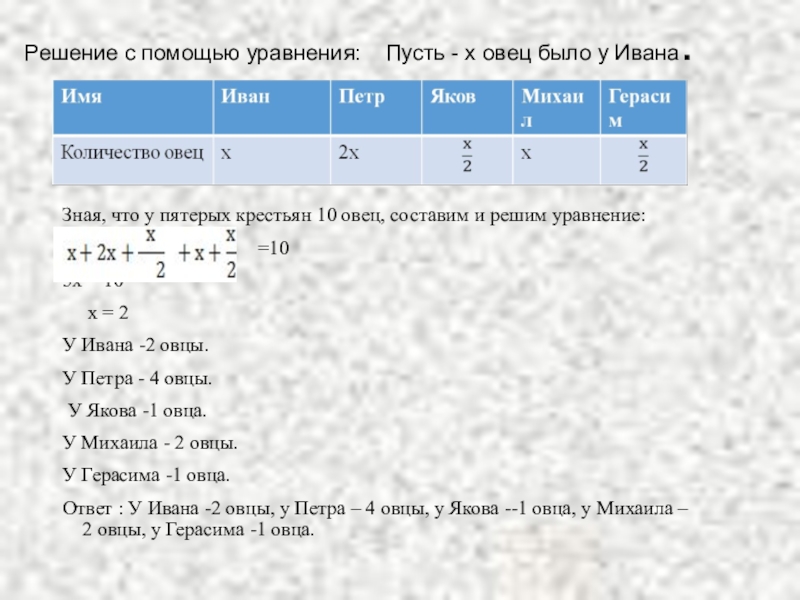 Зная, что у пятерых крестьян 10 овец, составим и решим уравнение:
