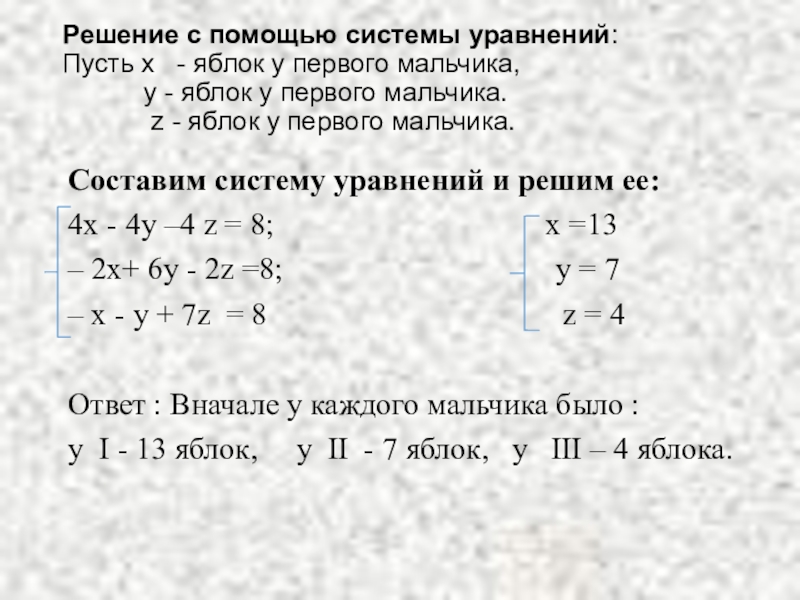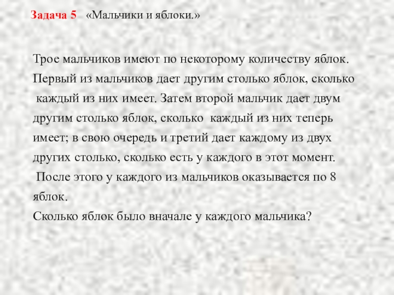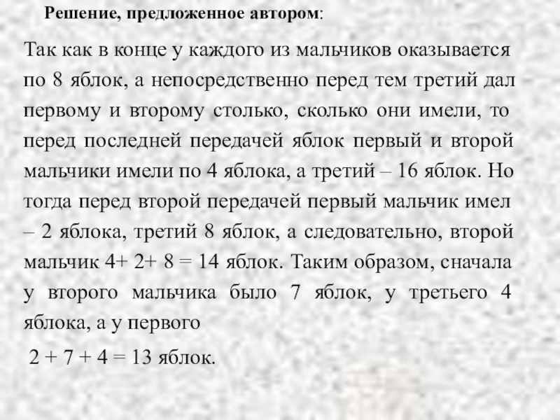 оказывается по 8 яблок, а непосредственно перед тем третий дал первому и второму столько, сколько они имели, то перед последней передачей яблок первый и второй мальчики имели по 4 яблока, а третий – 16 яблок. Но тогда перед второй передачей первый мальчик имел – 2 яблока, третий 8 яблок, а следовательно, второй мальчик 4+ 2+ 8 = 14 яблок. Таким образом, сначала у второго мальчика было 7 яблок, у третьего 4 яблока, а у первого