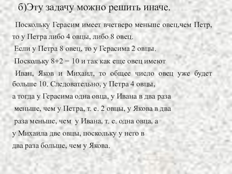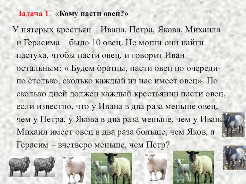 Якова, Михаила и Герасима – было 10 овец. Не могли они найти пастуха, чтобы пасти овец, и говорит Иван остальным: « Будем братцы, пасти овец по очереди- по столько, сколько каждый из нас имеет овец». По сколько дней должен каждый крестьянин пасти овец, если известно, что у Ивана в два раза меньше овец, чем у Петра, у Якова в два раза меньше, чем у Ивана; Михаил имеет овец в два раза больше, чем Яков, а Герасим – вчетверо меньше, чем Петр?