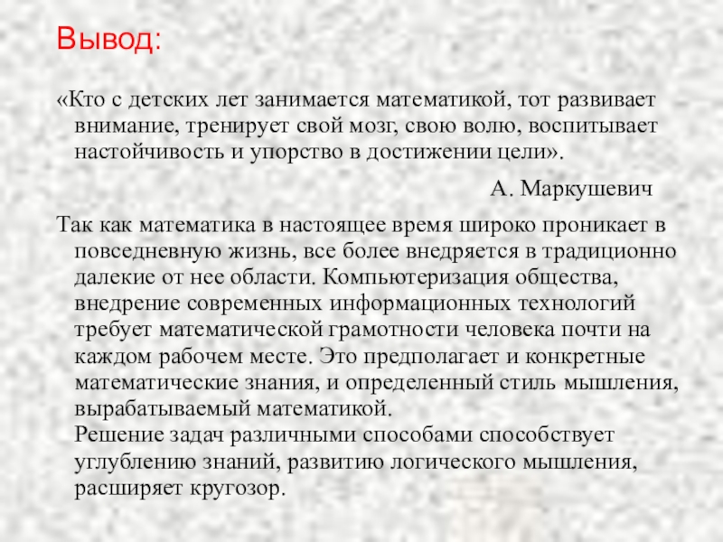 «Кто с детских лет занимается математикой, тот развивает внимание, тренирует