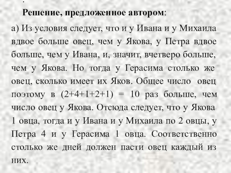 и у Михаила вдвое больше овец, чем у Якова, у Петра вдвое больше, чем у Ивана, и, значит, вчетверо больше, чем у Якова. Но тогда у Герасима столько же овец, сколько имеет их Яков. Общее число овец поэтому в (2+4+1+2+1) = 10 раз больше, чем число овец у Якова. Отсюда следует, что у Якова 1 овца, тогда и у Ивана и у Михаила по 2 овцы, у Петра 4 и у Герасима 1 овца. Соответственно столько же дней должен пасти овец каждый из них.