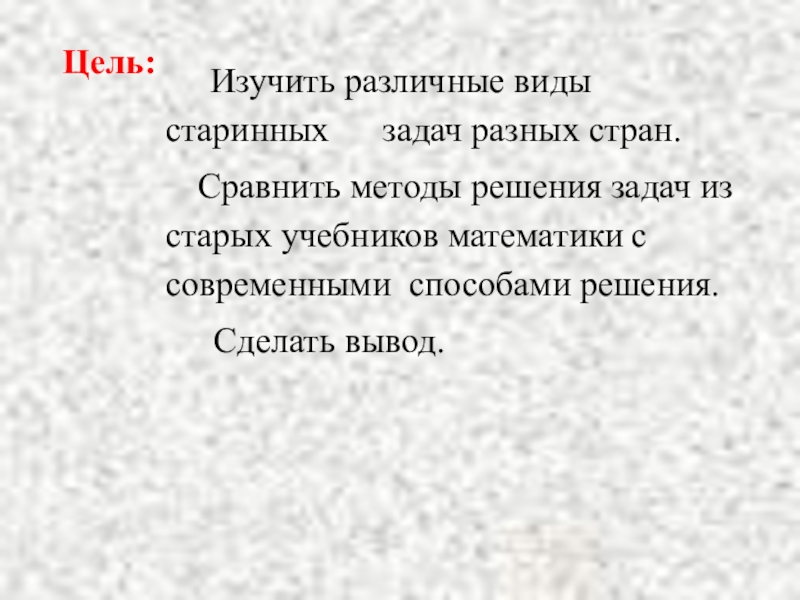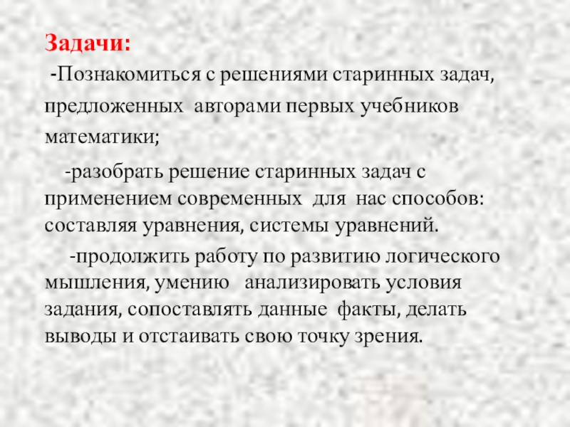 -Познакомиться с решениями старинных задач, предложенных авторами первых учебников математики;