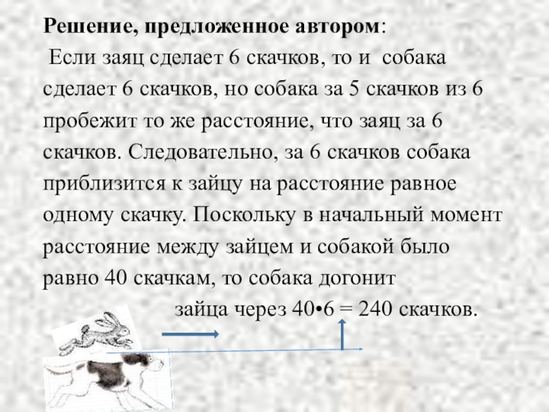 сделает 6 скачков, но собака за 5 скачков из 6 пробежит то же расстояние, что заяц за 6 скачков. Следовательно, за 6 скачков собака приблизится к зайцу на расстояние равное одному скачку. Поскольку в начальный момент расстояние между зайцем и собакой было равно 40 скачкам, то собака догонит