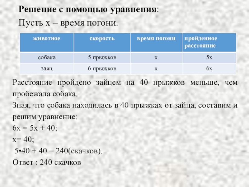 Зная, что собака находилась в 40 прыжках от зайца, составим и решим уравнение: