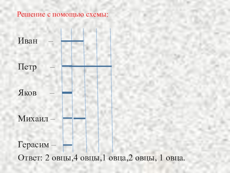 Ответ : У Ивана -2 овцы, у Петра – 4 овцы, у Якова --1 овца, у Михаила – 2 овцы, у Герасима -1 овца.