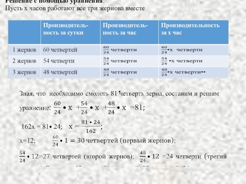 них за сутки можно смолоть 60 четвертей зерна, на втором 54 четверти, а на третьем 48 четвертей. Некто хочет смолоть 81 четверть зерна за наименьшее время на этих трех жерновах.