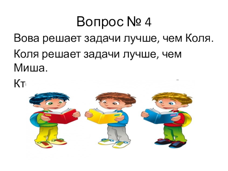 Вопрос № 4Вова решает задачи лучше, чем Коля.Коля решает задачи лучше, чем Миша. Кто решает задачи лучше