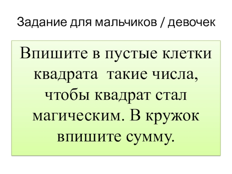 Задание для мальчиков / девочекВпишите в пустые клетки квадрата такие числа, чтобы квадрат стал магическим. В кружок