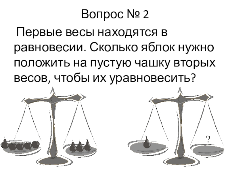 Вопрос № 2  Первые весы находятся в равновесии. Сколько яблок нужно положить на пустую чашку вторых