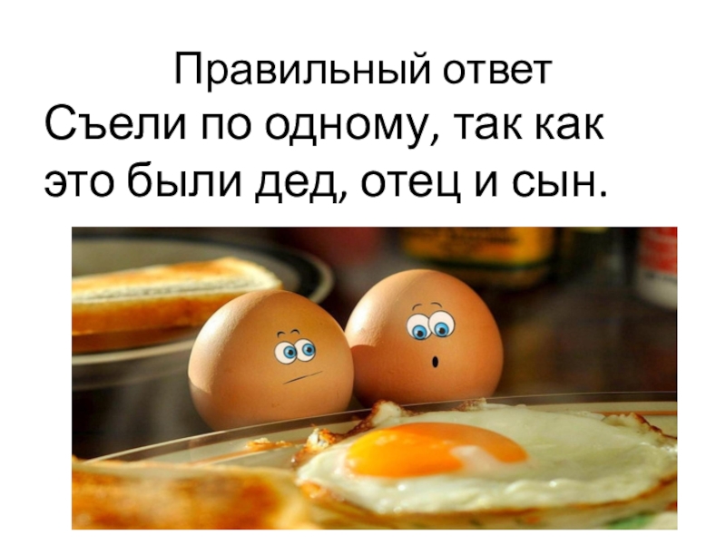 Вопрос № 5 Два сына и два отца съели 3 яйца. По сколько яиц съел каждый?