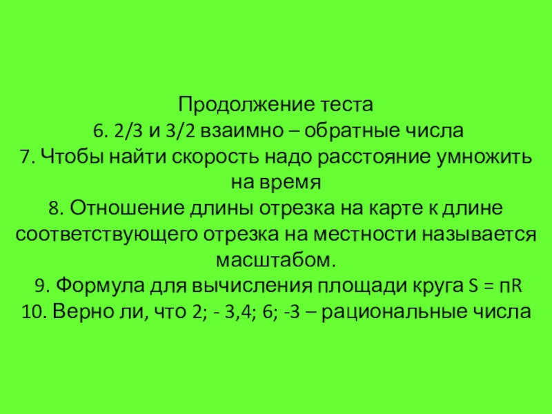 Слайд 8Продолжение теста 6. 2/3 и 3/2 взаимно – обратные числа 7.