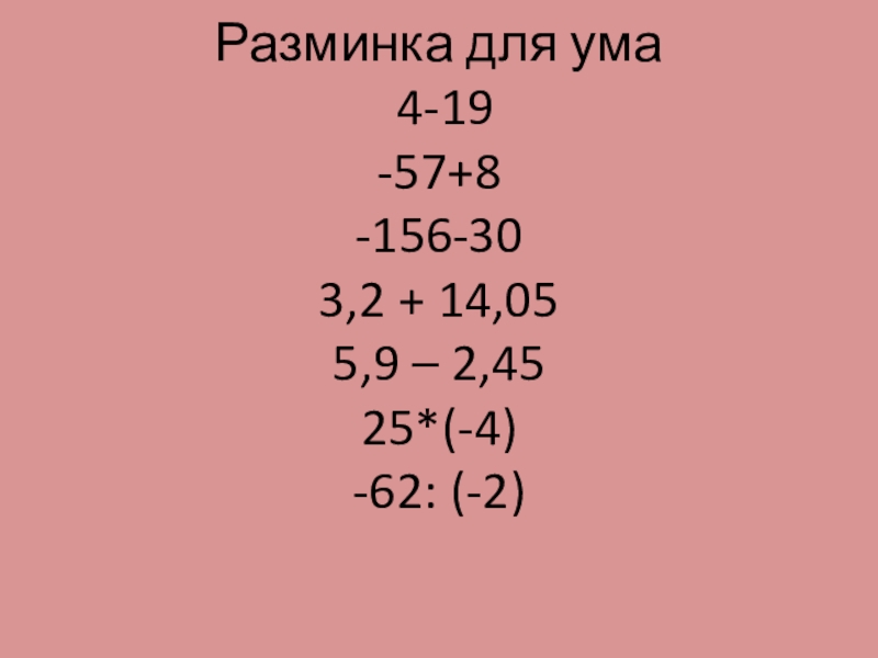 Слайд 5Разминка для ума 4-19 -57+8 -156-30 3,2 + 14,05 5,9 – 2,45 25*(-4) -62: (-2)