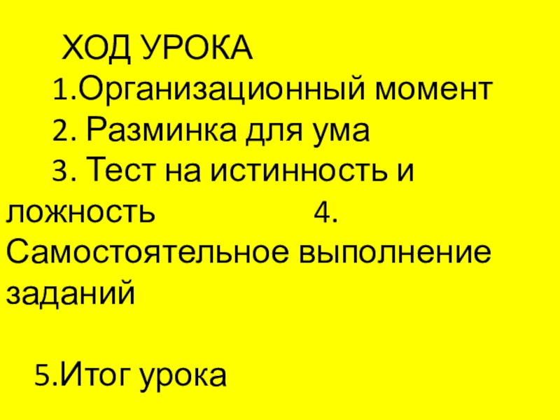 ума 3. Тест на истинность и ложность 4. Самостоятельное выполнение заданий 5.Итог урока
