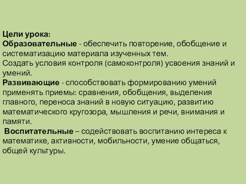тем. Создать условия контроля (самоконтроля) усвоения знаний и умений. Развивающие - способствовать формированию умений применять приемы: сравнения, обобщения, выделения главного, переноса знаний в новую ситуацию, развитию математического кругозора, мышления и речи, внимания и памяти. Воспитательные – содействовать воспитанию интереса к математике, активности, мобильности, умение общаться, общей культуры.