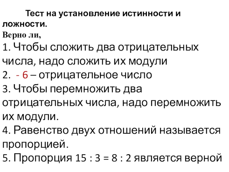 два отрицательных числа, надо сложить их модули 2. - 6 – отрицательное число 3. Чтобы перемножить два отрицательных числа, надо перемножить их модули. 4. Равенство двух отношений называется пропорцией. 5. Пропорция 15 : 3 = 8 : 2 является верной