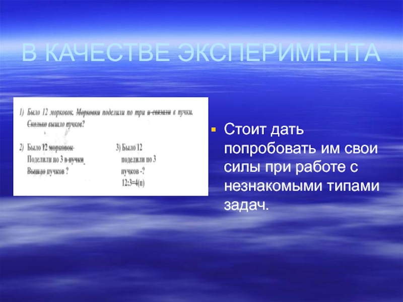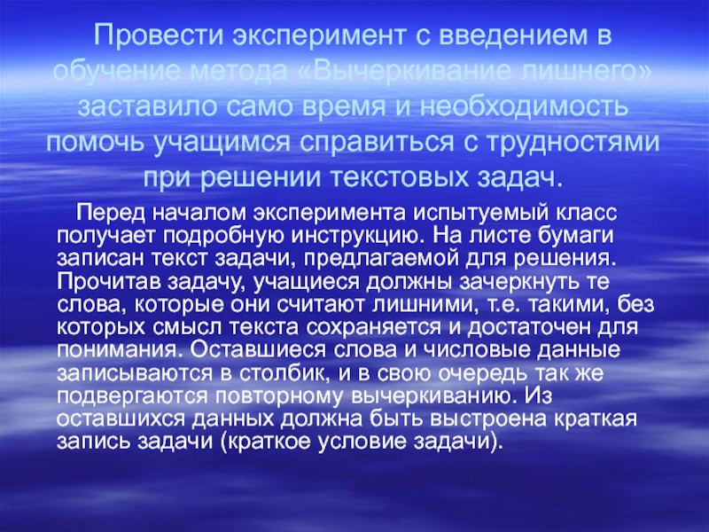 Перед началом эксперимента испытуемый класс получает подробную инструкцию. На листе бумаги записан текст задачи, предлагаемой для решения. Прочитав задачу, учащиеся должны зачеркнуть те слова, которые они считают лишними, т.е. такими, без которых смысл текста сохраняется и достаточен для понимания. Оставшиеся слова и числовые данные записываются в столбик, и в свою очередь так же подвергаются повторному вычеркиванию. Из оставшихся данных должна быть выстроена краткая запись задачи (краткое условие задачи).