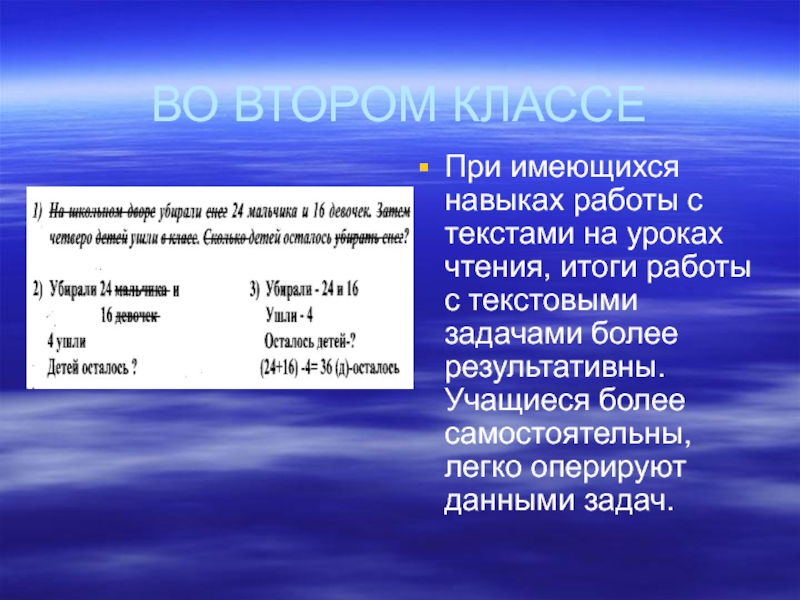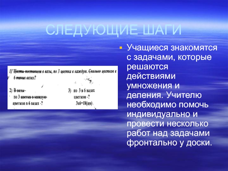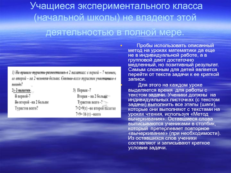 Для этого на каждом уроке выделяется время для работы с текстом задачи. Ученики должны на индивидуальных листочках (с текстом задачи) выполнить все этапы (шаги), которые они выполняют с текстами на уроках чтения, используя «Метод вычеркивания». Оставшиеся слова выписываются учениками в столбик, который претерпевает повторное «вычеркивание» (при необходимости). Из оставшихся слов ученики составляют и записывают краткое условие задачи.