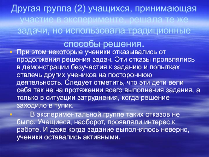 В экспериментальной группе таких отказов не было. Учащиеся, наоборот, проявляли интерес к работе. И даже когда задание выполнялось неверно, ученики оставались активными.