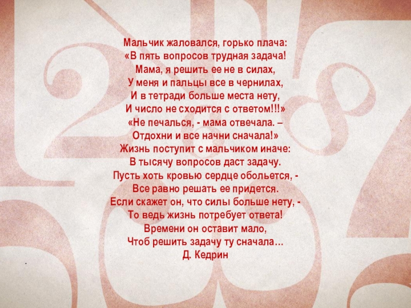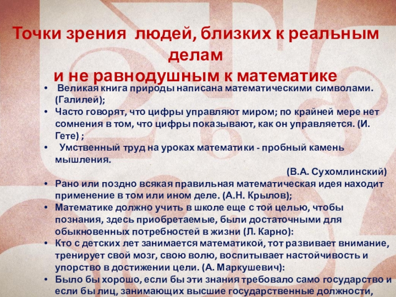 Кто с детских лет занимается математикой, тот развивает внимание, тренирует свой мозг, свою волю, воспитывает настойчивость и упорство в достижении цели. (А. Маркушевич):