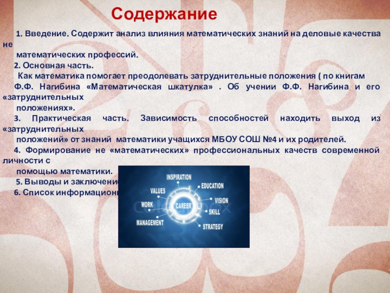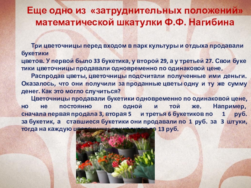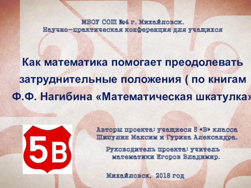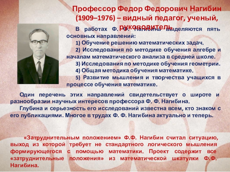 «Затруднительным положением» Ф.Ф. Нагибин считал ситуацию, выход из которой требует не стандартного логического мышления формирующегося с помощью математики. Проект содержит все «затруднительные положения» из математической шкатулки Ф.Ф. Нагибина.