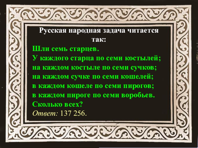 Это задача, которая примерно в то же время появляется в руководствах арифметики разных народов то о потомстве кроликов, то в виде задачи о вознаграждении изобретателя шахматной игры. Эти вычисления, по-видимому, были созданием таких «числолюбцев», как упомянутый уже Кирик новгородский.