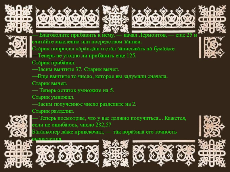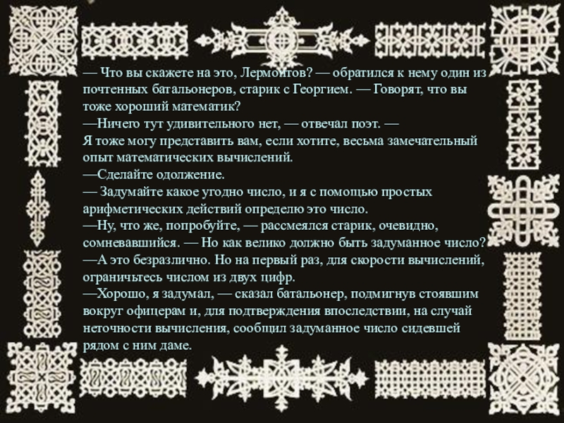 Слайд 47— Благоволите прибавить к нему, — начал Лермонтов, — еще 25