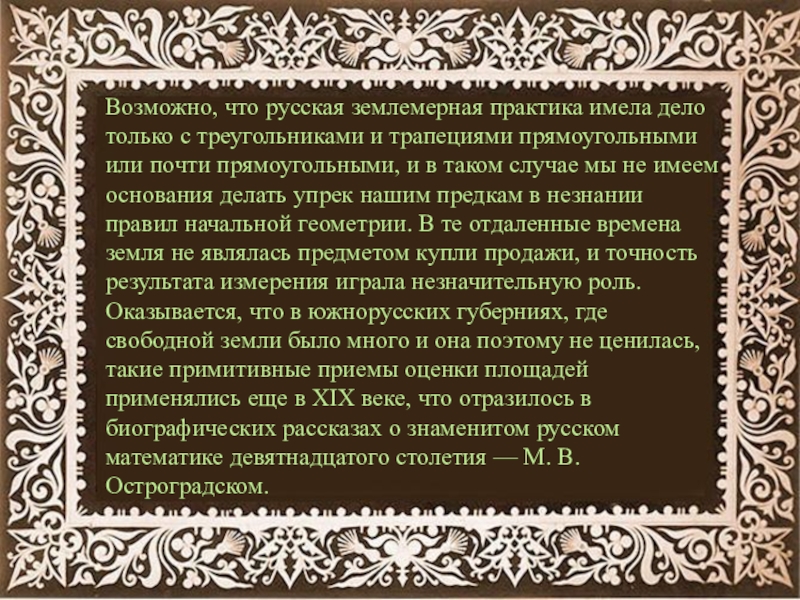 трапециями прямоугольными или почти прямоугольными, и в таком случае мы не имеем основания делать упрек нашим предкам в незнании правил начальной геометрии. В те отдаленные времена земля не являлась предметом купли продажи, и точность результата измерения играла незначительную роль. Оказывается, что в южнорусских губерниях, где свободной земли было много и она поэтому не ценилась, такие примитивные приемы оценки площадей применялись еще в XIX веке, что отразилось в биографических рассказах о знаменитом русском математике девятнадцатого столетия — М. В. Остроградском.