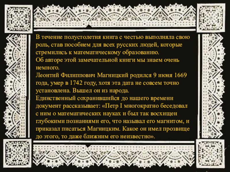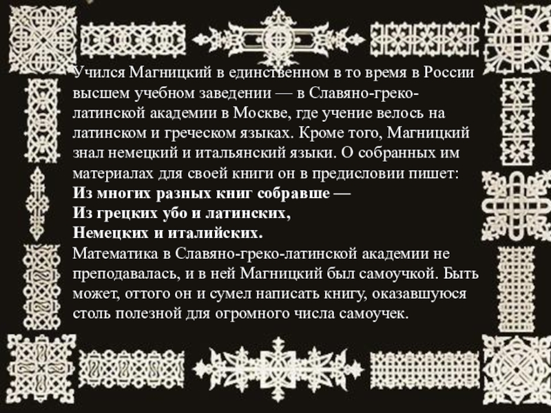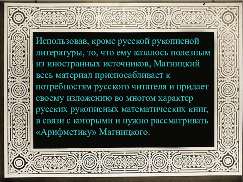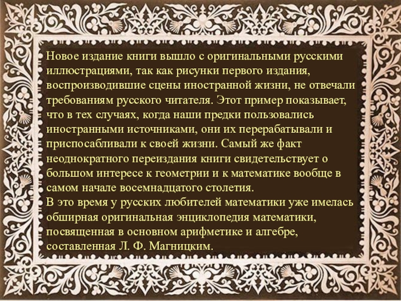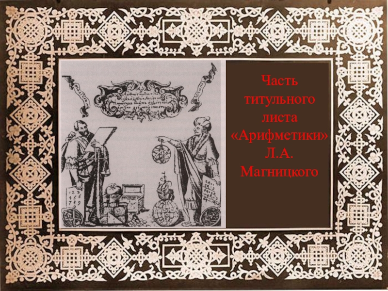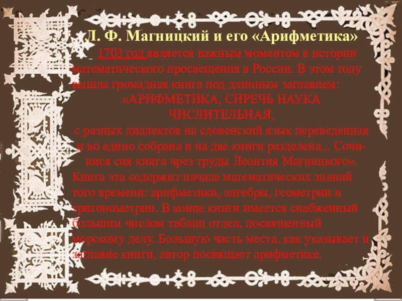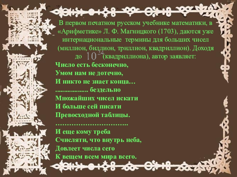 В первом печатном русском учебнике математики, в «Арифметике» Л. Ф. Магницкого