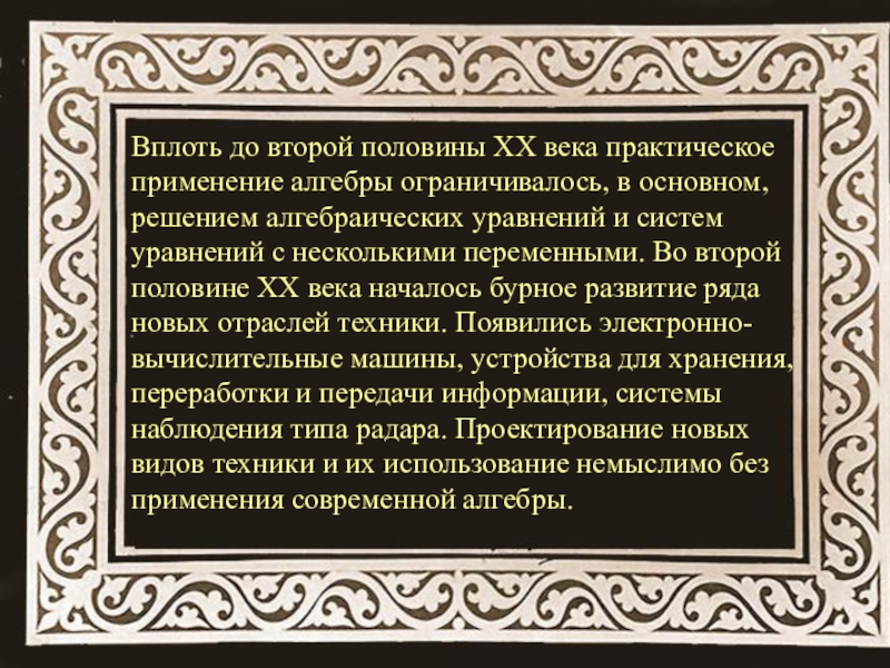 основном, решением алгебраических уравнений и систем уравнений с несколькими переменными. Во второй половине XX века началось бурное развитие ряда новых отраслей техники. Появились электронно-вычислительные машины, устройства для хранения, переработки и передачи информации, системы наблюдения типа радара. Проектирование новых видов техники и их использование немыслимо без применения современной алгебры.