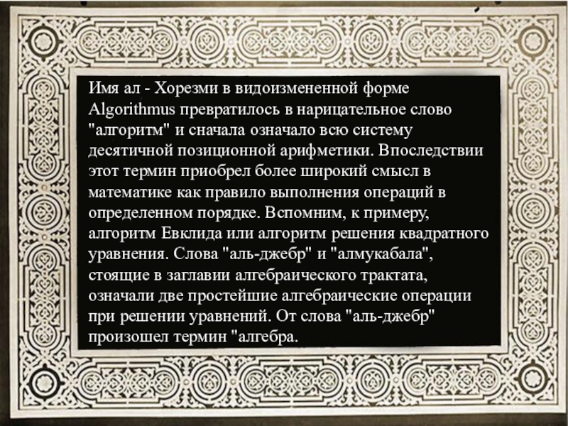слово "алгоритм" и сначала означало всю систему десятичной позиционной арифметики. Впоследствии этот термин приобрел более широкий смысл в математике как правило выполнения операций в определенном порядке. Вспомним, к примеру, алгоритм Евклида или алгоритм решения квадратного уравнения. Слова "аль-джебр" и "алмукабала", стоящие в заглавии алгебраического трактата, означали две простейшие алгебраические операции при решении уравнений. От слова "аль-джебр" произошел термин "алгебра.