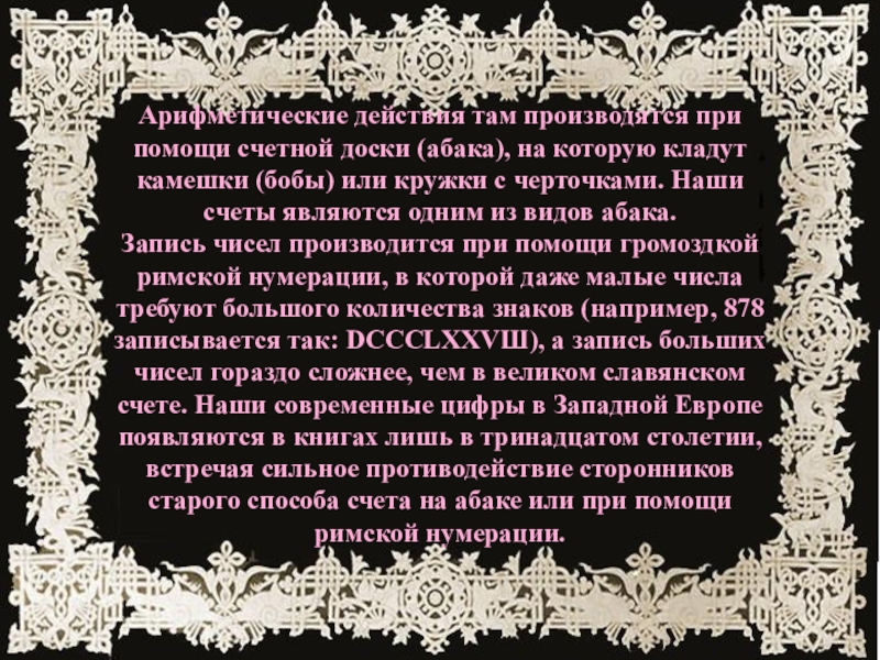 Запись чисел производится при помощи громоздкой римской нумерации, в которой даже малые числа требуют большого количества знаков (например, 878 записывается так: DСССLХХVШ), а запись больших чисел гораздо сложнее, чем в великом славянском счете. Наши современные цифры в Западной Европе появляются в книгах лишь в тринадцатом столетии, встречая сильное противодействие сторонников старого способа счета на абаке или при помощи римской нумерации.