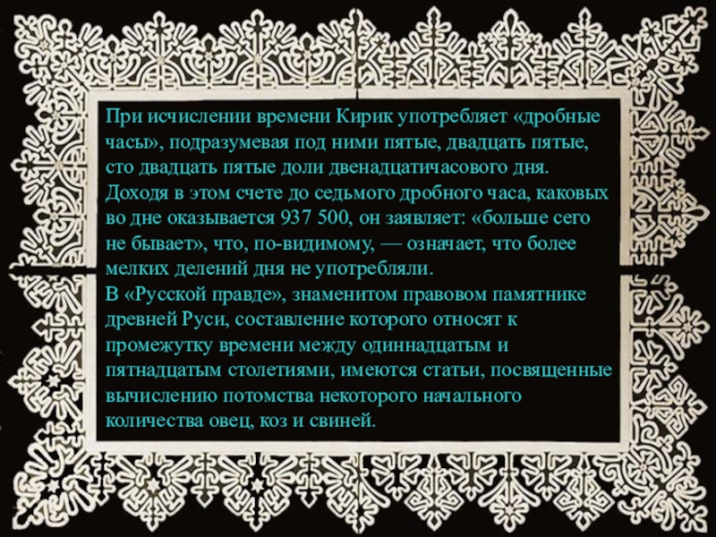 При исчислении времени Кирик употребляет «дробные часы», подразумевая под ними пятые,