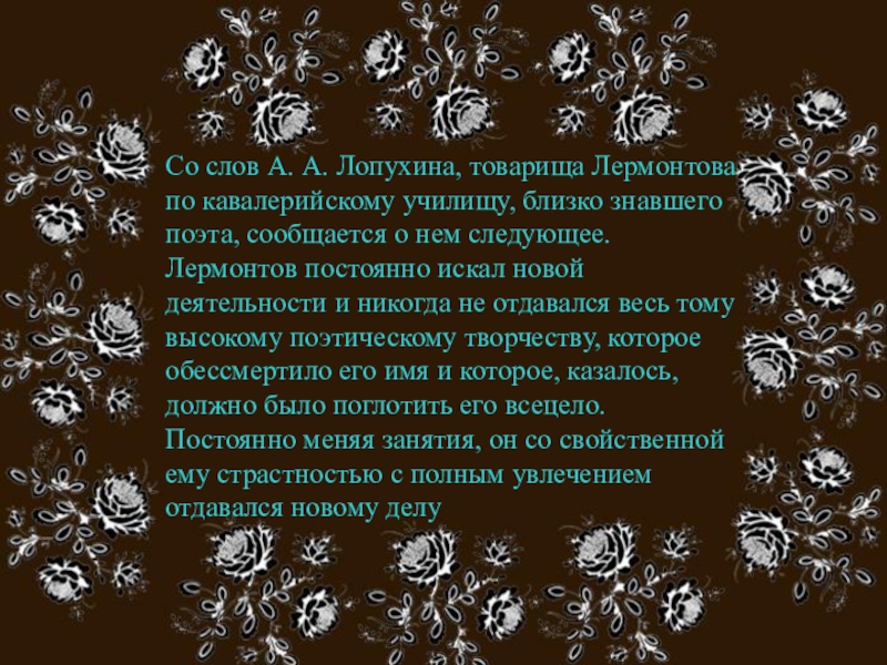 Слайд 50Со слов А. А. Лопухина, товарища Лермонтова по кавалерийскому училищу, близко