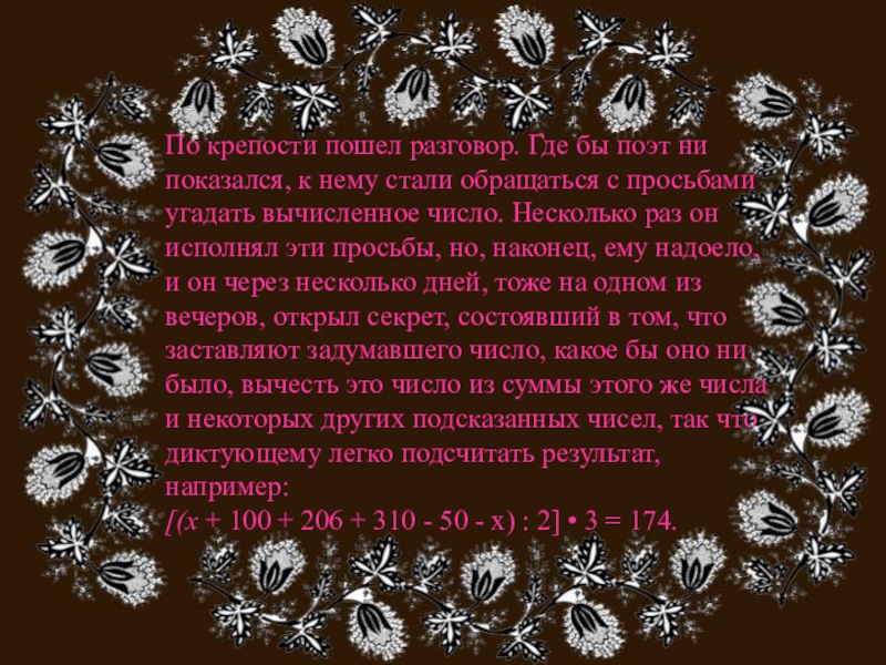 Старик записал задуманное число, никому не показав, положил под подсвечник и стал считать в уме даваемые поэтом числа. И на этот раз остаток был угадан.