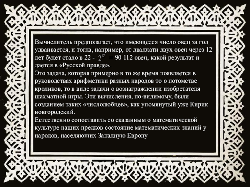 например, от двадцати двух овец через 12 лет будет стадо в 22 - = 90 112 овец, какой результат и дается в «Русской правде».