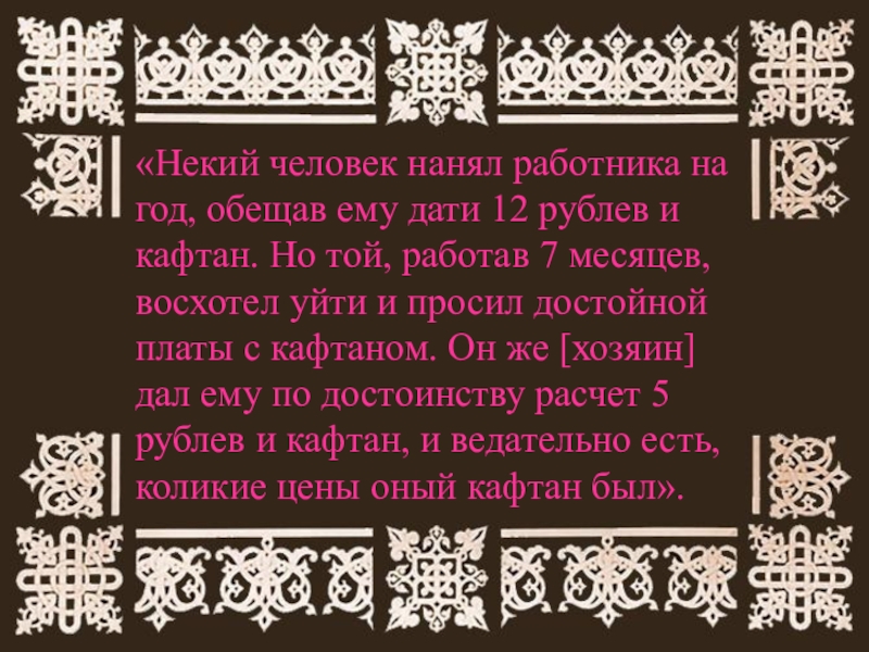 Слайд 66«Некий человек нанял работника на год, обещав ему дати 12 рублев
