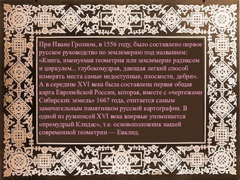 А в середине XVI века была составлена первая общая карта Европейской России, которая, вместе с «чертежами Сибирских земель» 1667 года, считается самым замечательным памятником русской картографии. В одной из рукописей XVI века впервые упоминается «премудрый Клидас», т.е. основоположник нашей современной геометрии — Евклид.