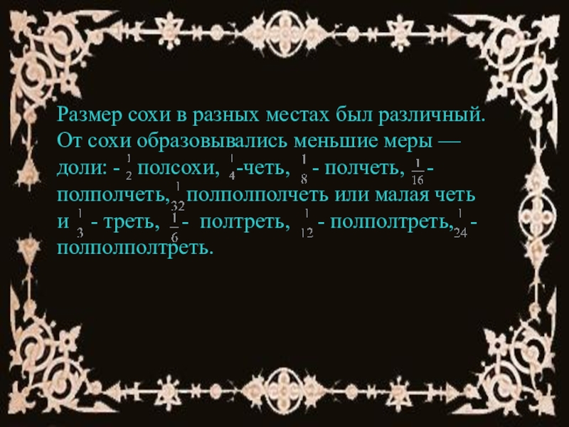 меры — доли: - полсохи, -четь, - полчеть, - полполчеть, полполполчеть или малая четь и - треть, - полтреть, - полполтреть, - полполполтреть.