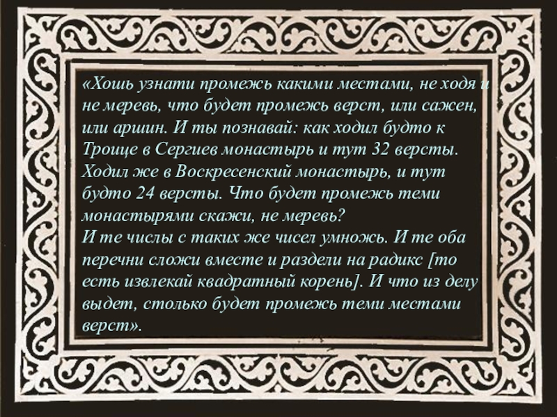 будет промежь верст, или сажен, или аршин. И ты познавай: как ходил будто к Троице в Сергиев монастырь и тут 32 версты. Ходил же в Воскресенский монастырь, и тут будто 24 версты. Что будет промежь теми монастырями скажи, не меревь?