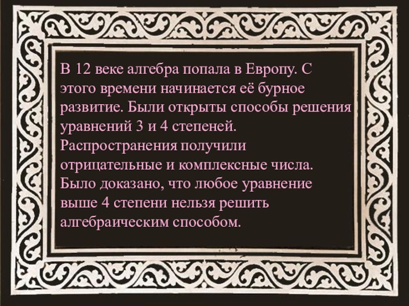 В 12 веке алгебра попала в Европу. С этого времени начинается